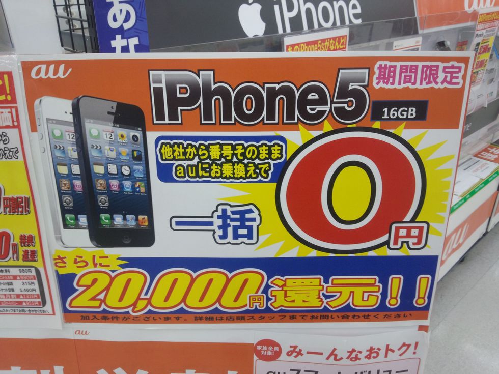 スマホ売り場に行くと、auのコーナーで、アップル社のiphone5という少し前のモデルになるものが、端末代金一括0円に、プラスキャッシュバック商品券2万円と売り出していました。