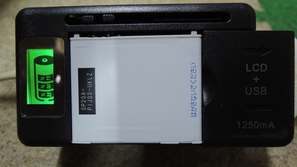 上記は、香港から届いたユニバーサルチャージャーにガラケー(携帯電話端末)の小さなリチウムイオンバッテリーを挟んで充電している写真です。