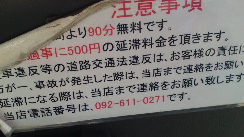運転席側のドアの内張りに、90分まで無料、延滞金は30分ごとに500円という破格な値段でした。