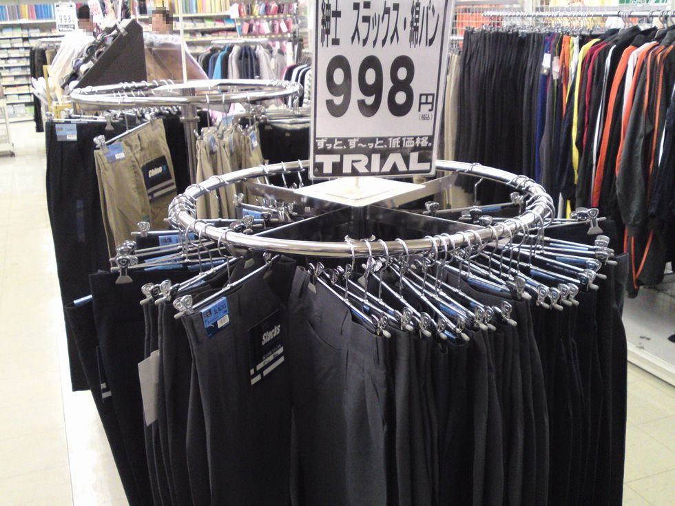 上記は、トライアル福岡空港店で売っていたビジネススラックスの写真です。 1本¥998で、別のカジュアル系スラックスは、1本¥1,500程度でしたので、安いと思います。