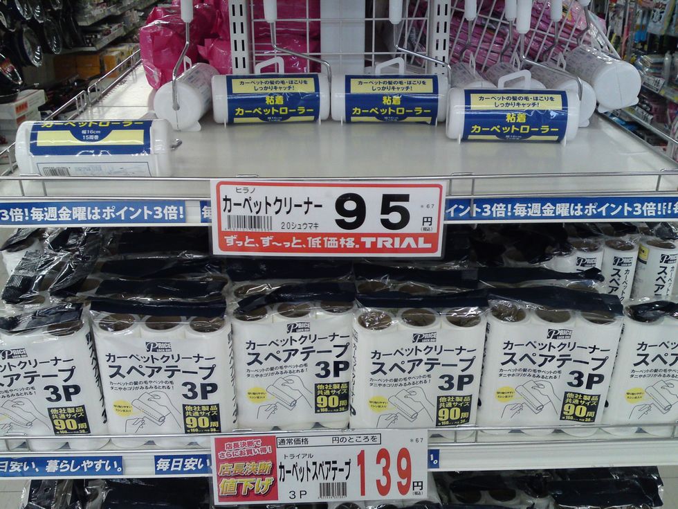 上記は、トライアル福岡空港店で売っていた、カーペットをコロコロする掃除用です。 家の中で犬を飼っていたりするとついコロコロしたりするアレですが、1個¥95で、スペア用が3個で¥139でした。
