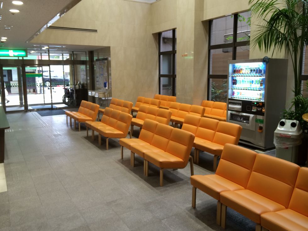 入り口から入って最初にオレンジ色のイスがあり会計待ちのイスです。奥にはブルーの診察待ちのイスもあります。(休日なので外来者のない時の写真撮影となっております)