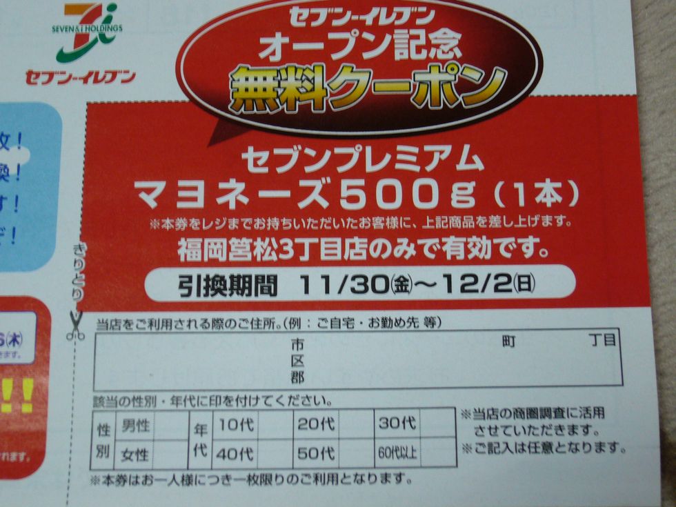 セブンイレブン福岡箱崎店のオープンの時と同じマヨネーズを1本いただきました。