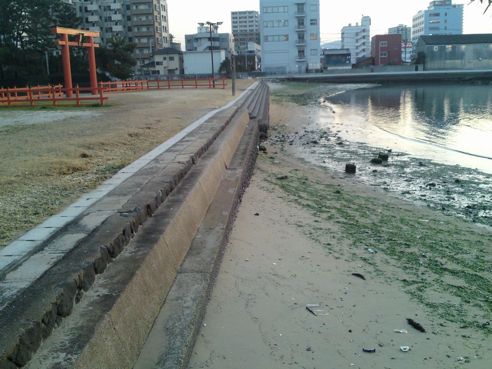 上記が、筥崎宮の真裏の砂浜です。 小学生の頃は、授業中に先生がクラスの人間を引き連れて、よくここで遊んだりしていました。 赤い鳥居が夕日側に向いています。