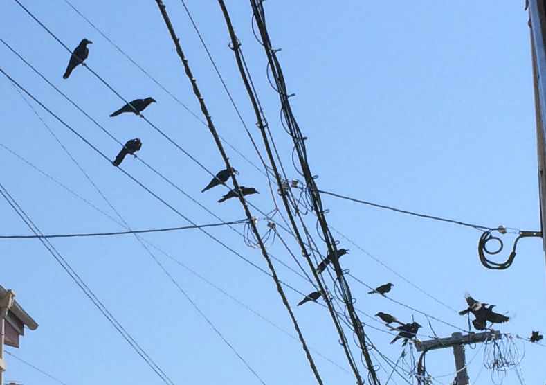 1つの噂のようなものですが、なんでもカラスの赤ちゃんが道路に1羽いて、それを親鳥に知らせる為にカラスが自然と集まり、電線の上でカア~カア~鳴いていたみたい・・・