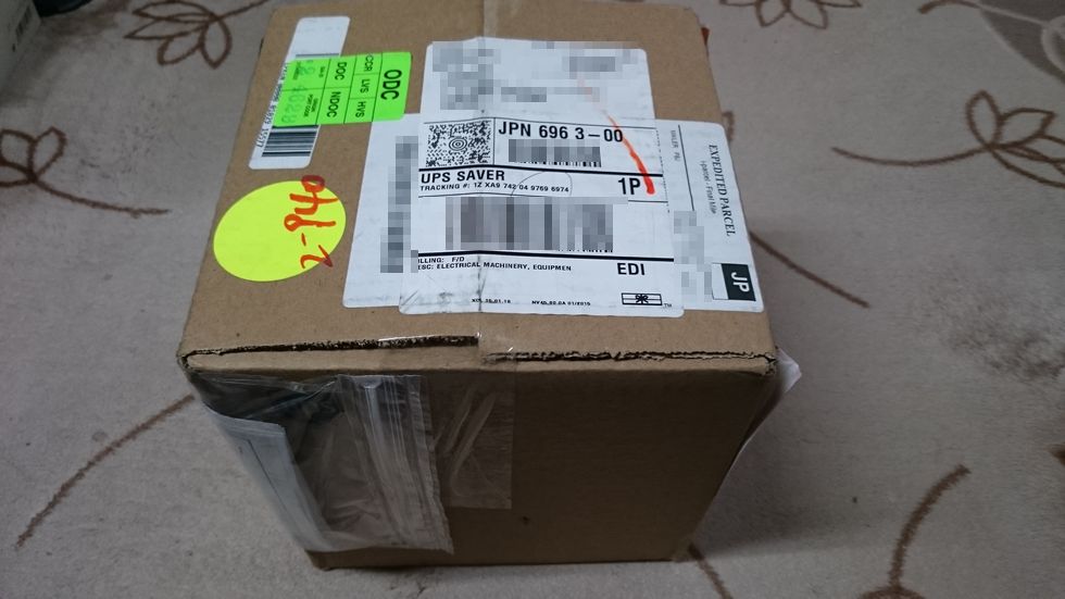 上記がアメリカから届いた荷物の箱の写真です。インボイスなどが箱の側面などにいっぱい貼ってあります。