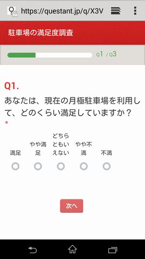 後は、「どういう質問がしたいのか?」という項目があり、私の場合は満足度調査というライ塩ボタン選択という風にチョイスしました。