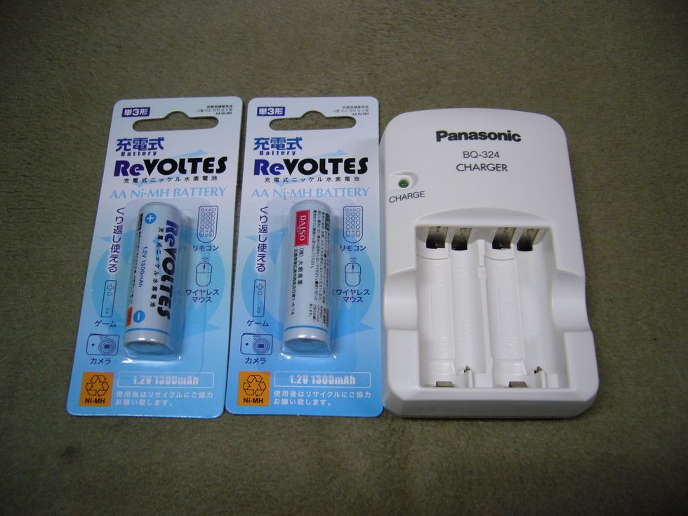 充電する器具は、同じく¥100で売っているので、それもすでに買ったのですが、通常ニッケル水素充電池は、パナソニック製のものがマイコン制御で充電池が痛みにくく、使いやすいと思います。