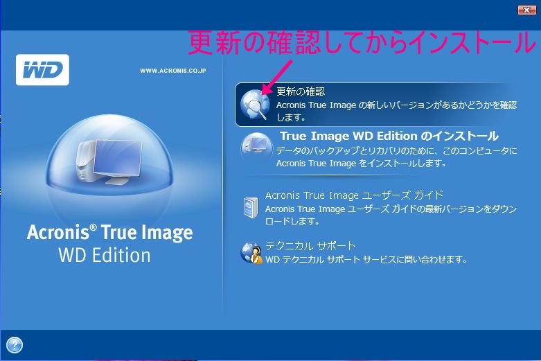 ダウンロードしたファイルを開くと、そのAcronis True Image WD Edition のインストール画面が出ますので、最新バージョンのチェックをした後でインストールします。
