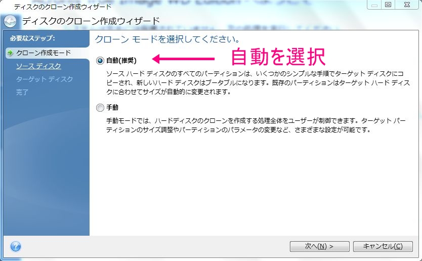 事前にコピー元のパーティションをフリーソフトで調整していたので、自動を選択します。
