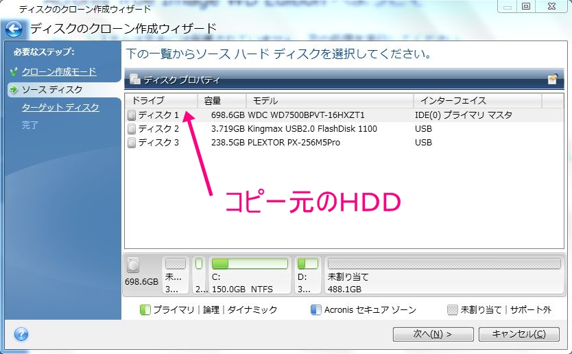 Acronis True Image WD Editionを起動しますと、PCに接続された機器の情報を自動で読み取り下記のように起動してきます。