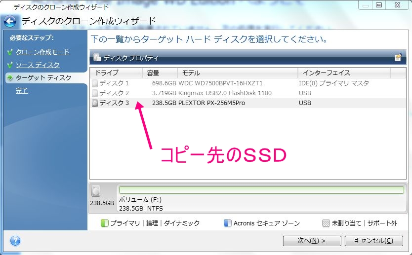 ディスクは、見たいSSDを指定しますので、ここではプレクスターをクリックします。