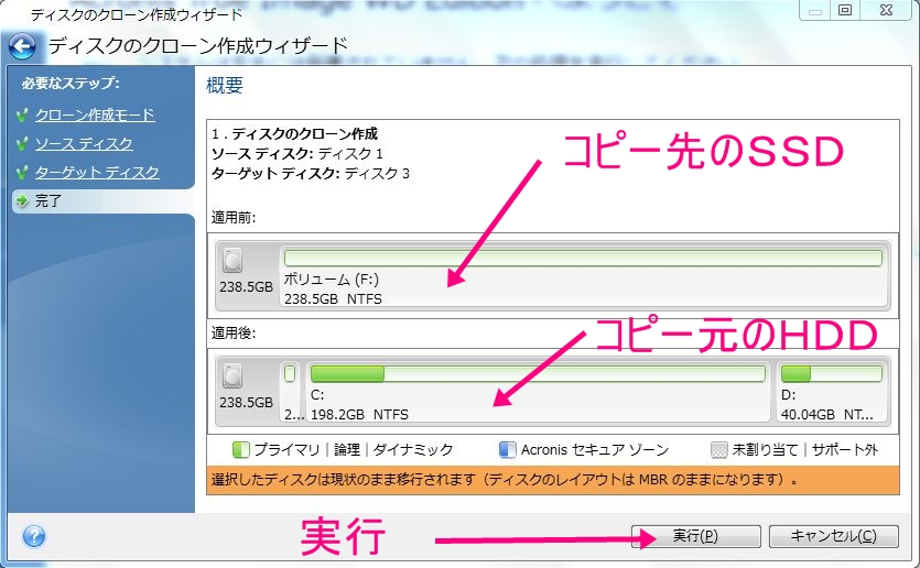 左サイドバーのメニューに完了と書かれていますので、今まで指定した内容が表示されますので、確認し実行ボタンを押します。