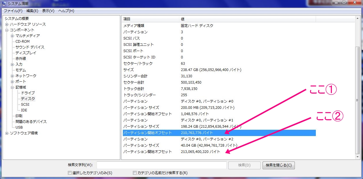 左サイドーバーのメニューを参照しながら、【コンポーネント】 → 【記憶域】 → 【ディスク】 という順番で進み、そこで表示される「パーティション開始オフセット」という項目の数字をマジックナンバー【4096】で割ります。