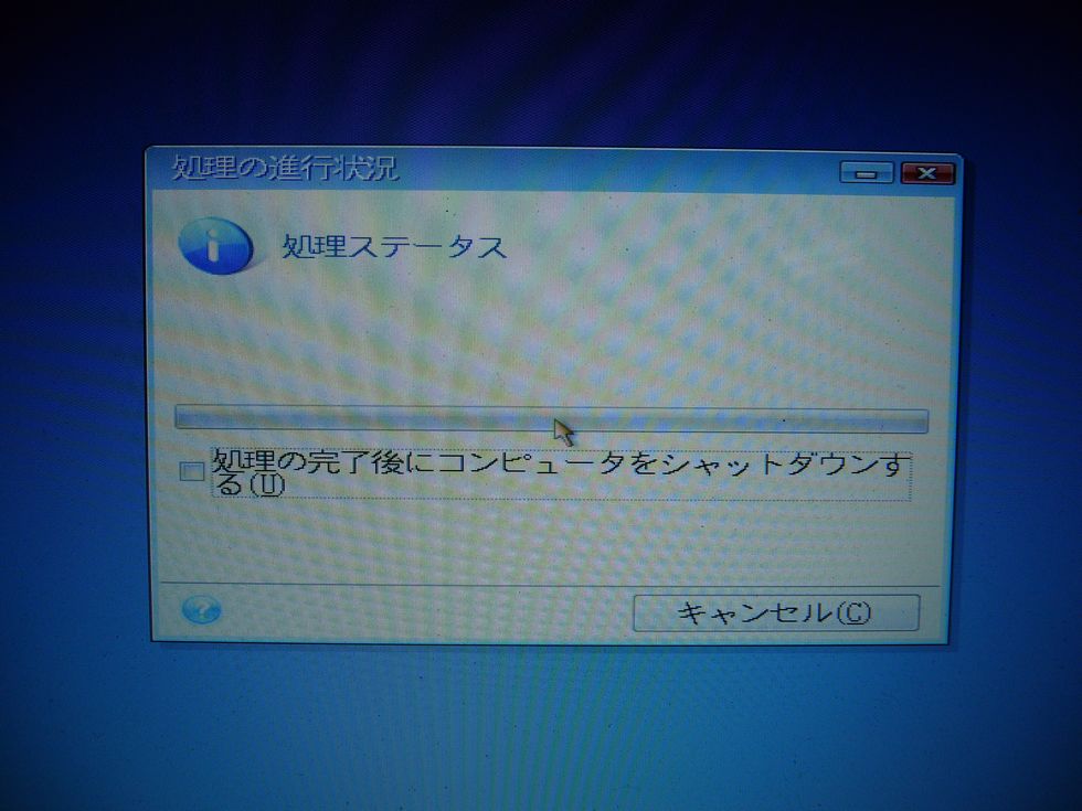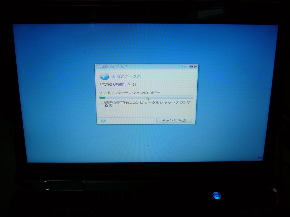 後は、PCが再起動となり、そこで実際の処理が始まります。ここでは、終了後にシャットダウンするというチェックを入れないでおくと、終了後自動で再起動になりますので、ウィンドウズが立ち上がりますので、そこで外付けのSSDが綺麗にできているかをチェックし、チェック後に終了させ、バッテリーをはずし、SSDを換装します。