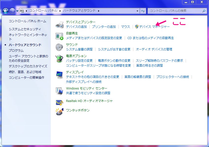 まずコントロールパネルを開き、デバイスをクリックします。