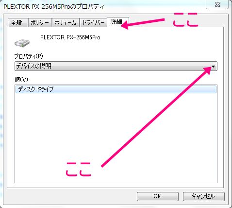 PLEXTORのプロパティの詳細タブを選択し、次に下のプルダウンよりハードウェアのID番号表示を選択しますと、管理識別番号が1,03となっていますので、「これがバージョンの管理番号ではないだろうか?」 と仮説を立てます。