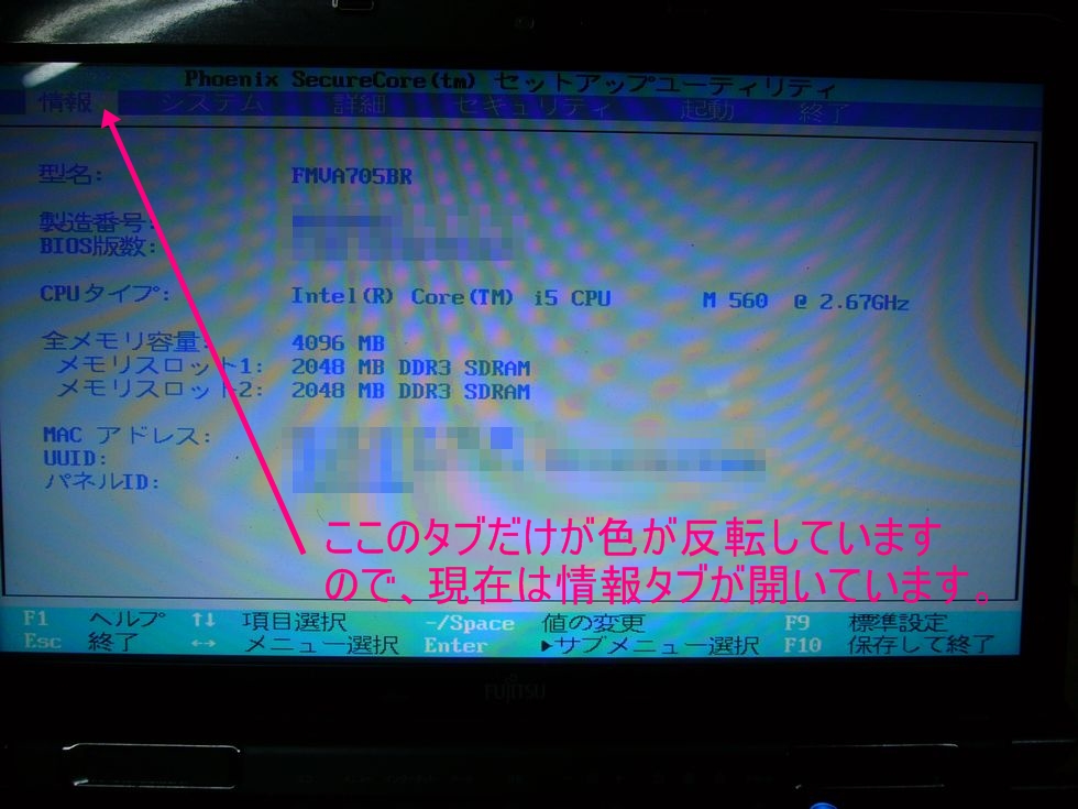 上記が富士通製のハイエンドノートPCの実際のBIOS設定画面が開いた状態です。 矢印の先にタブキーがここだけ白く反転してますので、情報タブが開いていることがわかると思います。