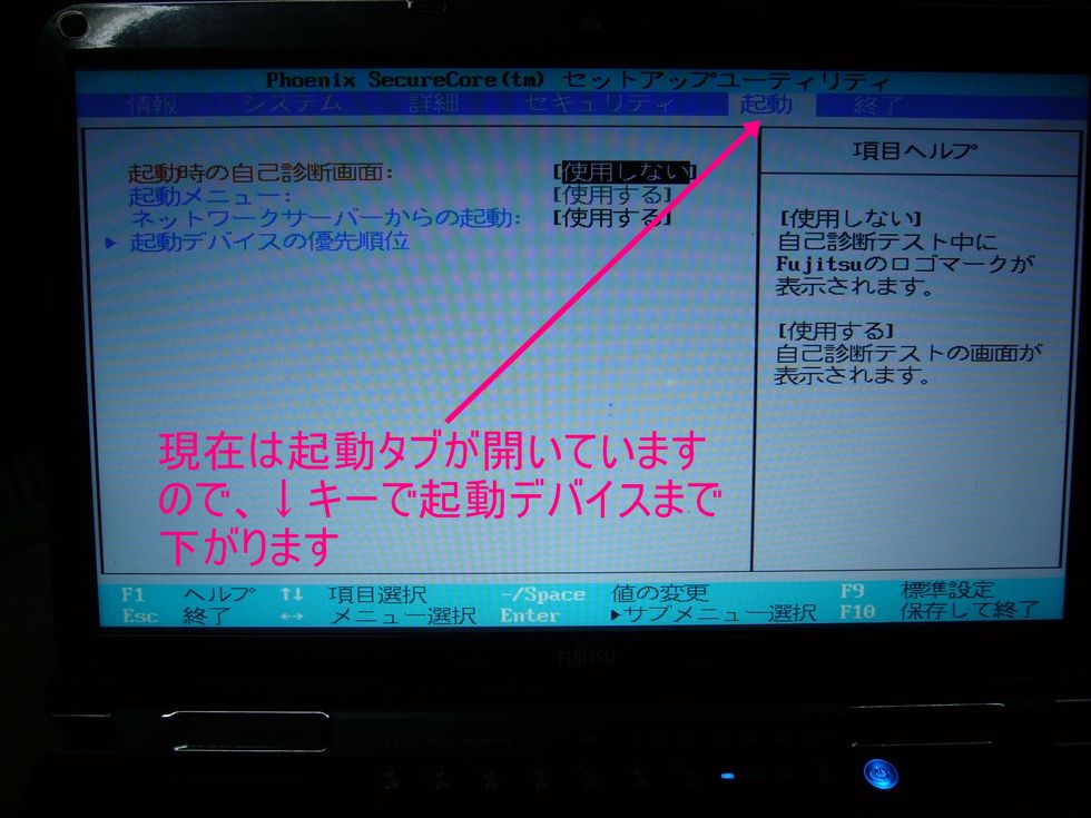ここでは富士通のノートPCのBIOS設定画面を載せていますが、基本はどれも同じです。