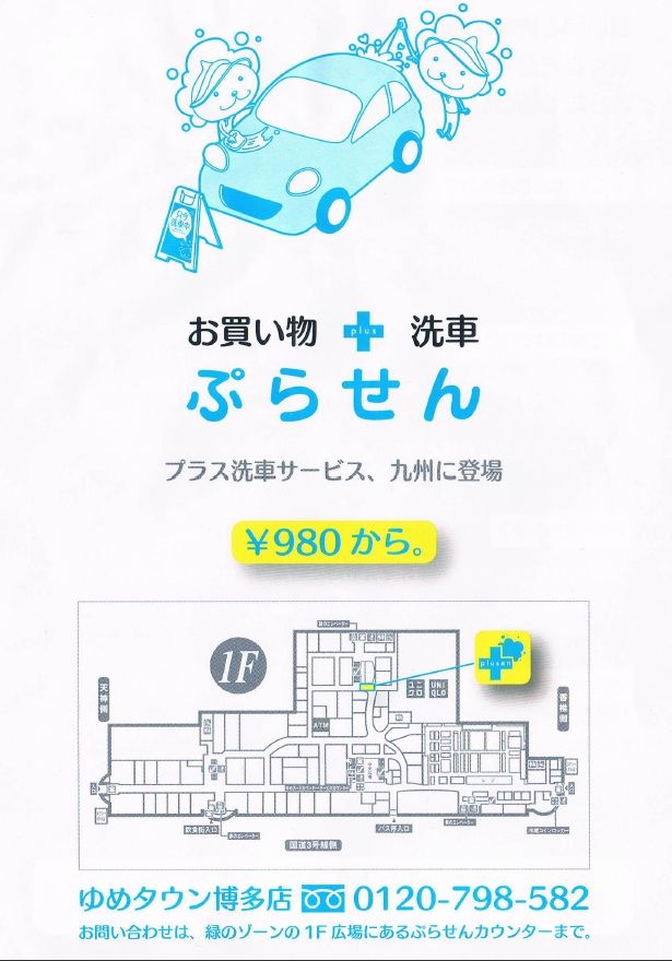 なんでも、ゆめタウン博多店に買い物に来て、「今駐車場のどこに駐車しています」 という風に、フリーダイヤルに携帯から電話すれば、洗車サービスの人が駆けつけてくれ、35~40分程度のお買い物をしている間に洗車をしてくれるのだそうです。