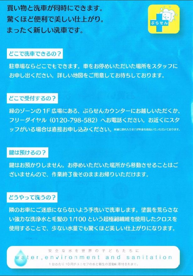 今日ゆめタウンに行った時に、帰る際に「駐車場になんだかスタッフの人が多いね」 なんて話していると、それは洗車サービスの男性だったみたいで、上記のチラシをもらいました。