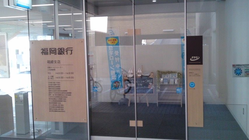 上記が、駐車場の方から歩いて行くとある福岡銀行箱崎支店の入り口です。 車だと雨の降る日でも、濡れませんので、西日本シティ銀行よりも便利に感じます。