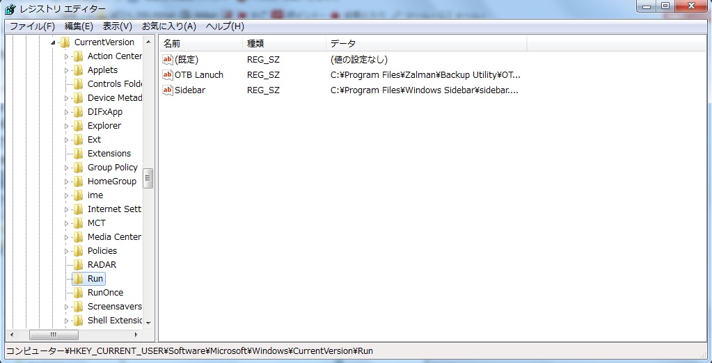 そうすると、下記の画像のように、OTB Lanch REG_SZ C:program Files ¥Zalmanという風になっているものが1つありますので、これをカーソルをあてて、右クリックで削除します。