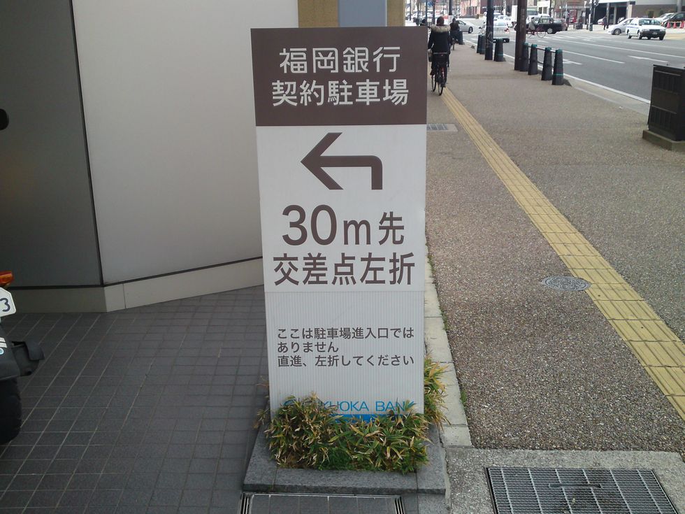 福岡銀行箱崎支店のビルの1階に、「30Mほど直進された後に左折してください」 という駐車場の入口の案内の看板があります。