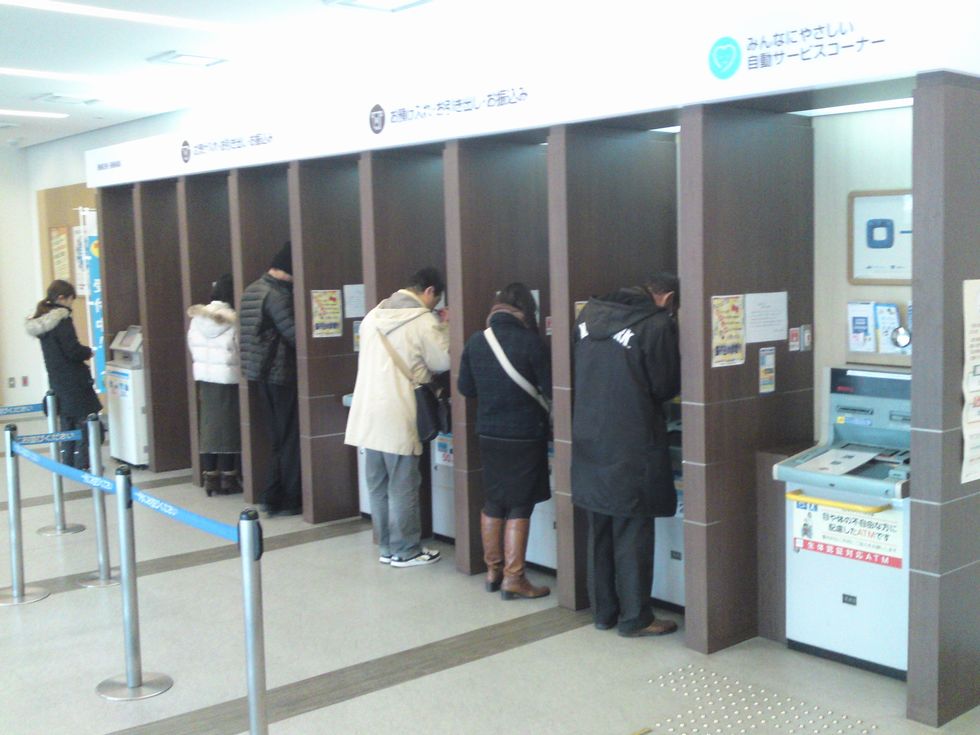 上記が駐車場から歩いて中に入った福岡銀行箱崎支店の1階のATMコーナーとなります。 2階に階段などで昇っていくと、窓口がありますが、ATMの方が早いです。