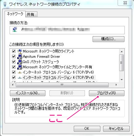 上記の画像ではグレー反転しているように見えますが、実際は青色で、IPv4の箇所が青色反転したら、<プロパティ>をクリックします。