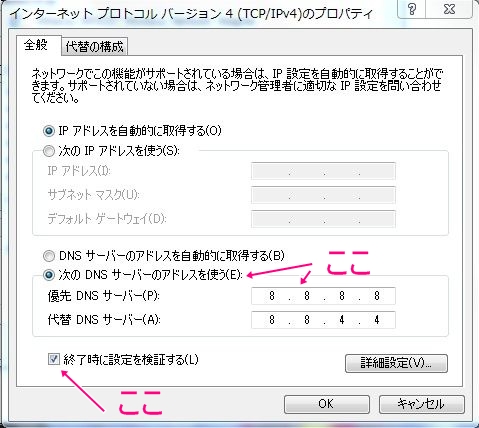 上記の画像のように、優先DNSサーバーを8.8.8.8 代替DNSサーバーを8.8.4.4 と入力します。