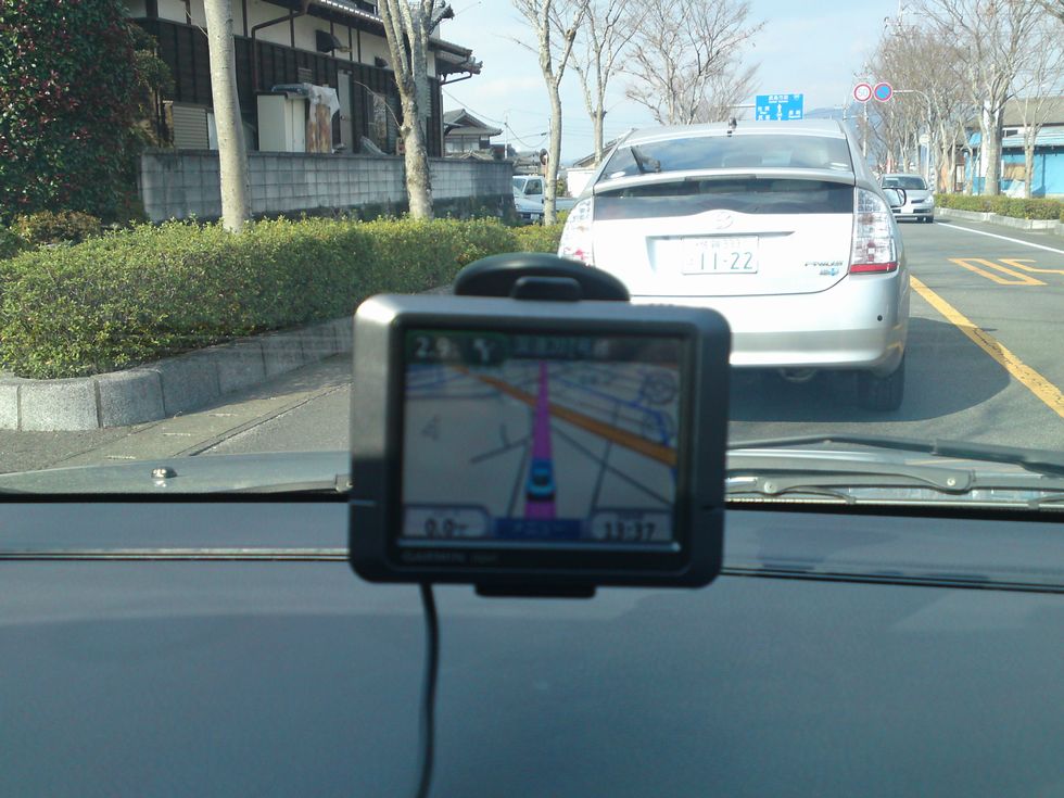 上記が帰り道で撮影したフロントガラスに貼りつけたカーナビです。 今回は行ったこともある祐徳稲荷神社でしたので、ガーミン社のコンパクトなタイプを使用しました。 初めて行く場所ではソニー製、丁寧な音声案内ではパナソニック製を使用します。