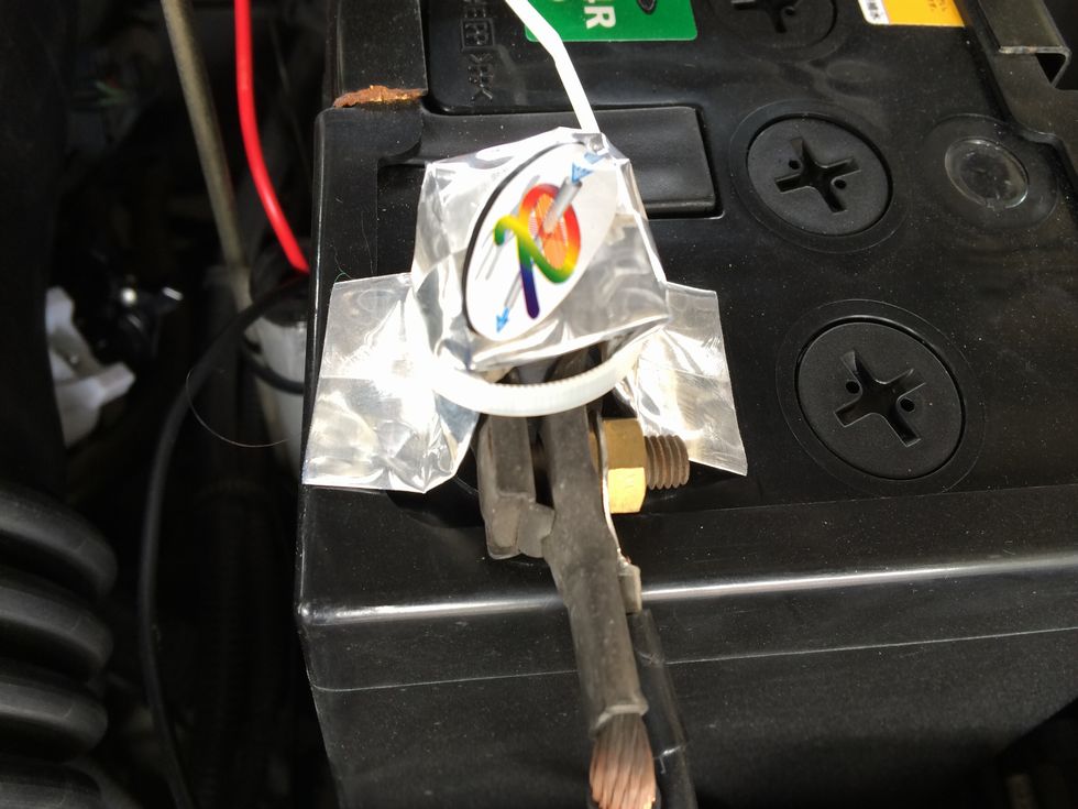 激カンタムイオンバランサーというものが、半額の¥4,800で売られたいたので、試しに買って装着してみました。バッテリーのマイナス端子に写真のように取り付けるだけでした。